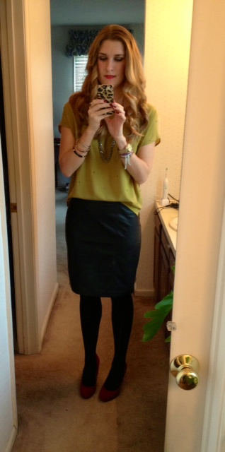 Outfit 1: Top: Ann Taylor Loft. Leather Skirt: Forever 21. Necklace: Forever 21. Tights: Kensie. Pumps: Franco Sarto.