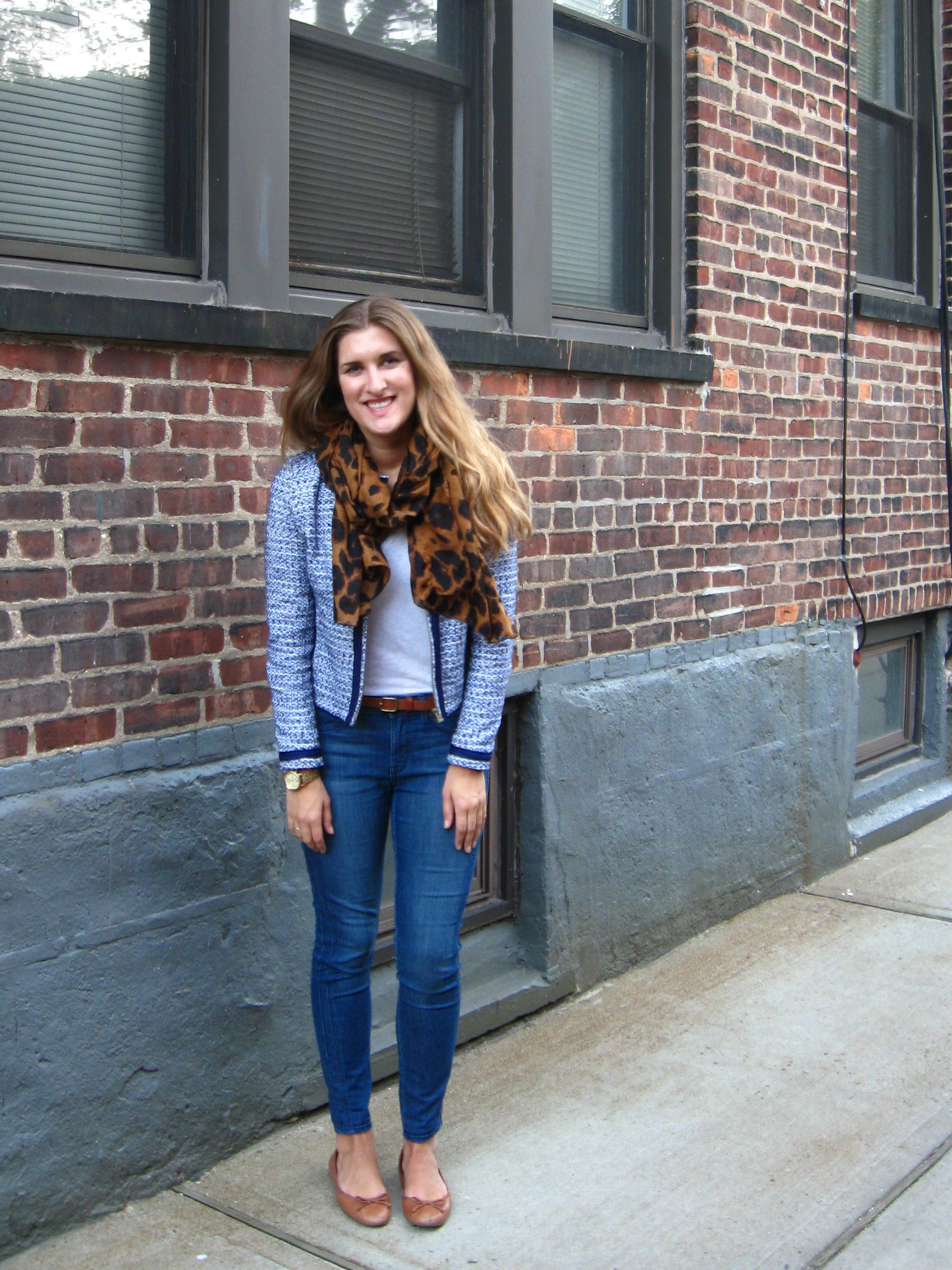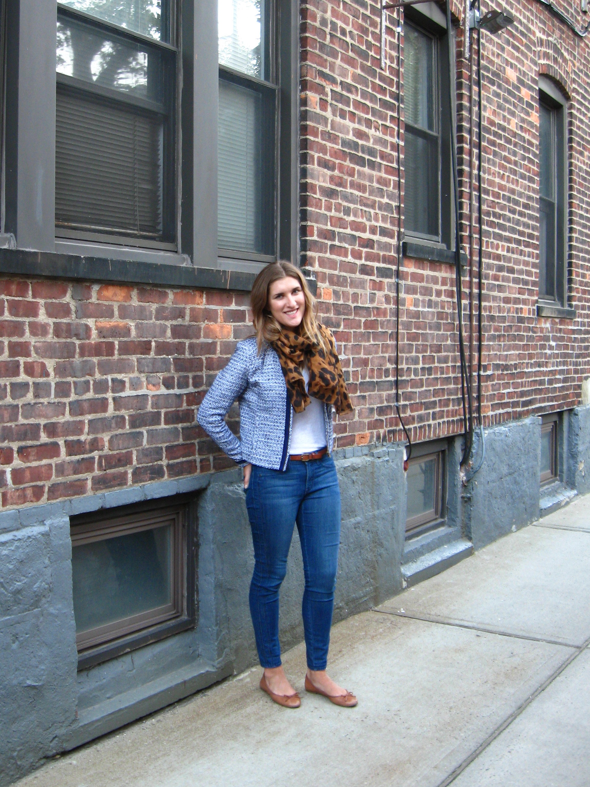 [The Details: Tee: J.Crew; Jacket: Lucky; Scarf: Random; Jeans: Rich & Skinny; Flats: Banana Republic]