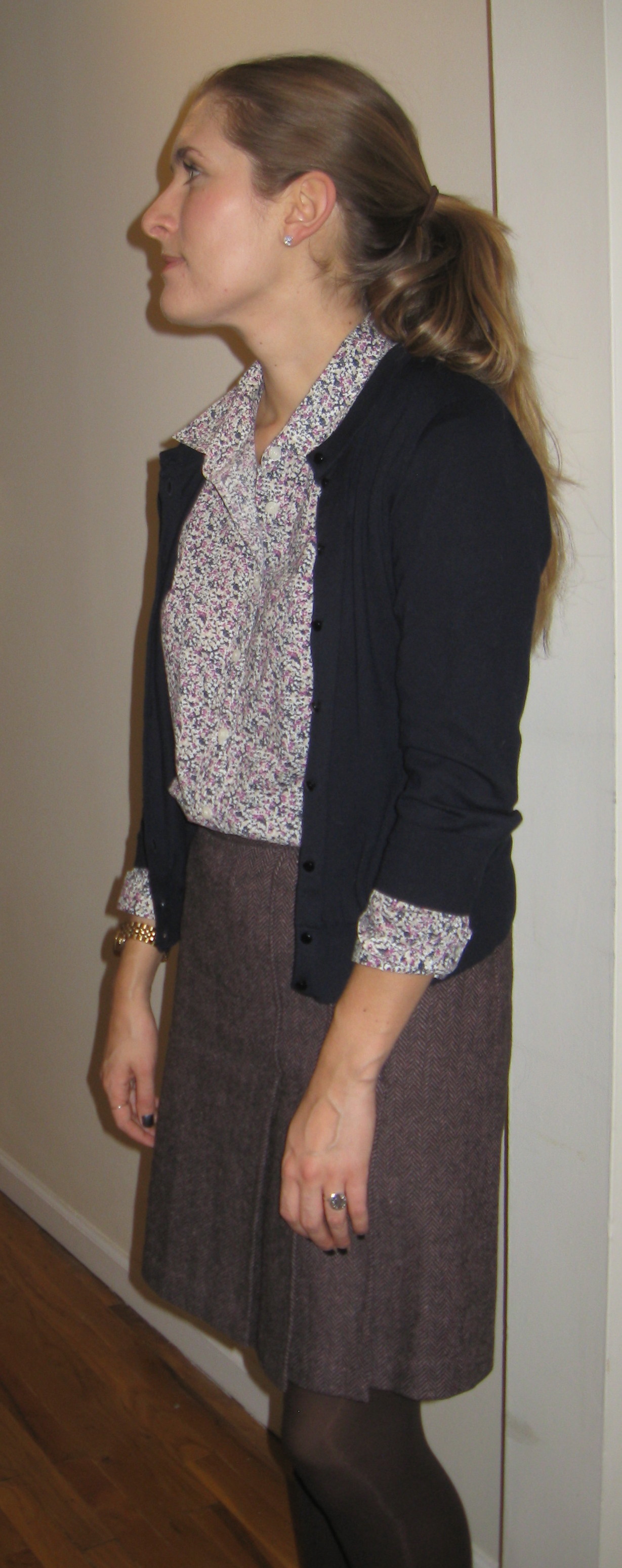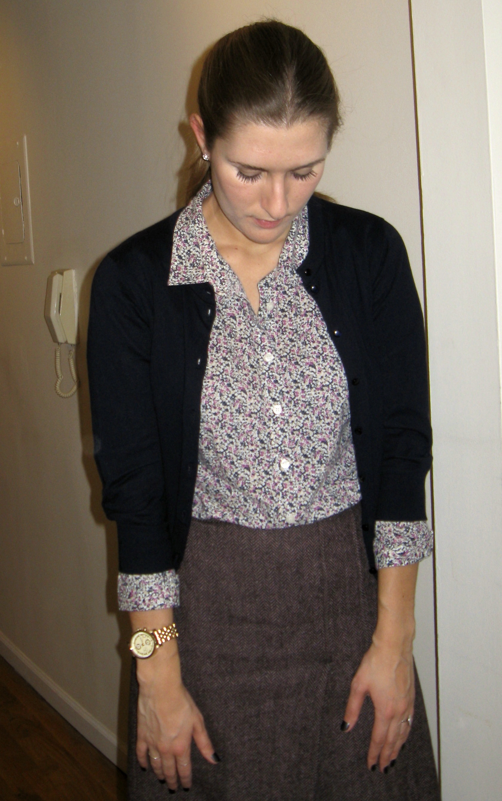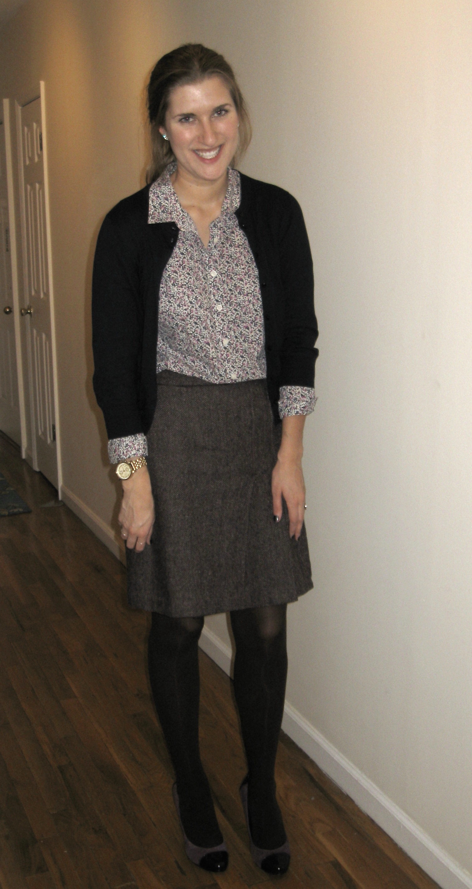 [Outfit Details: Button down: J.Crew; Skirt: Banana Republic; Cardigan: J.Crew; Tights: Target; Shoes: Ralph Lauren]