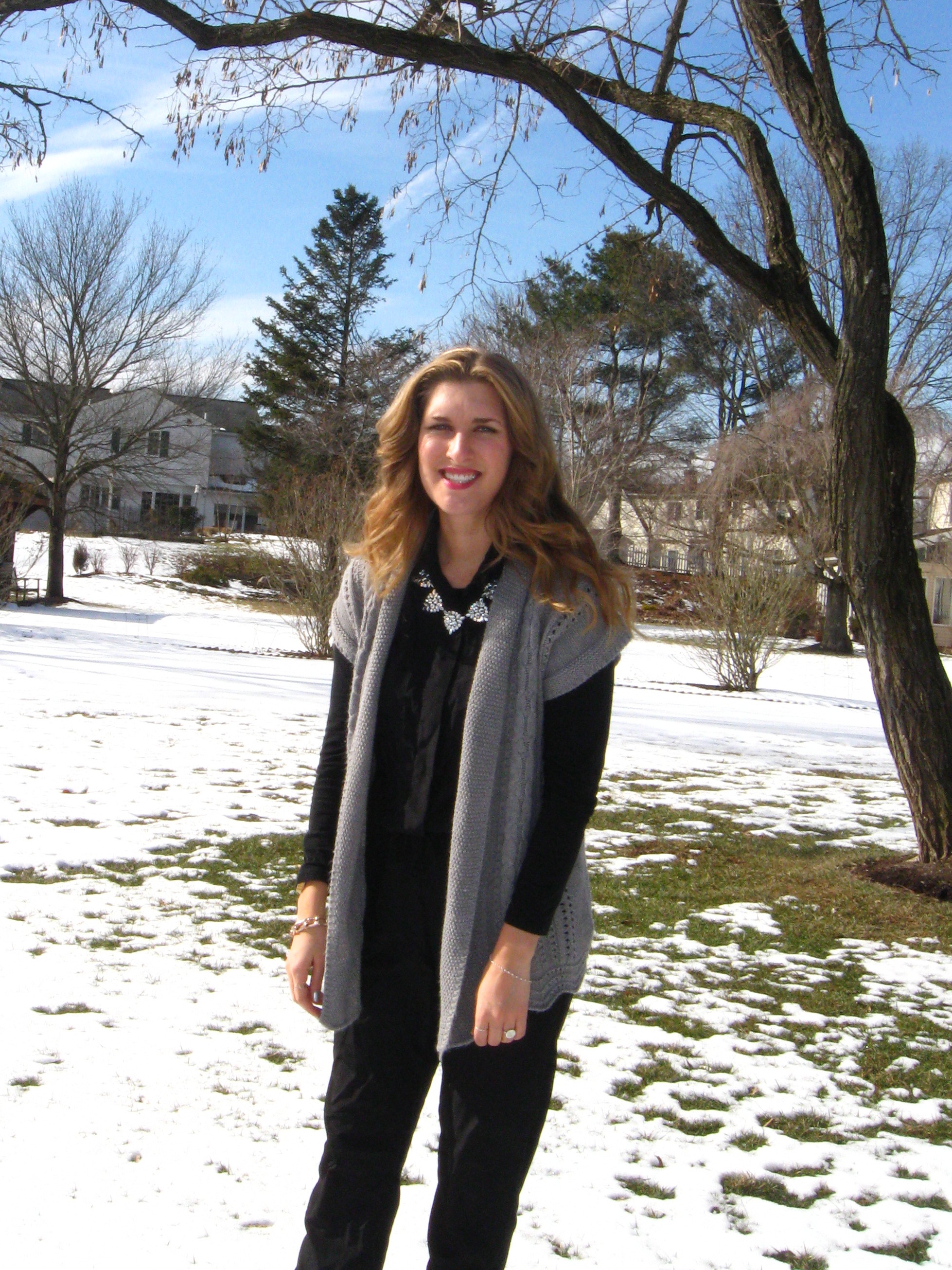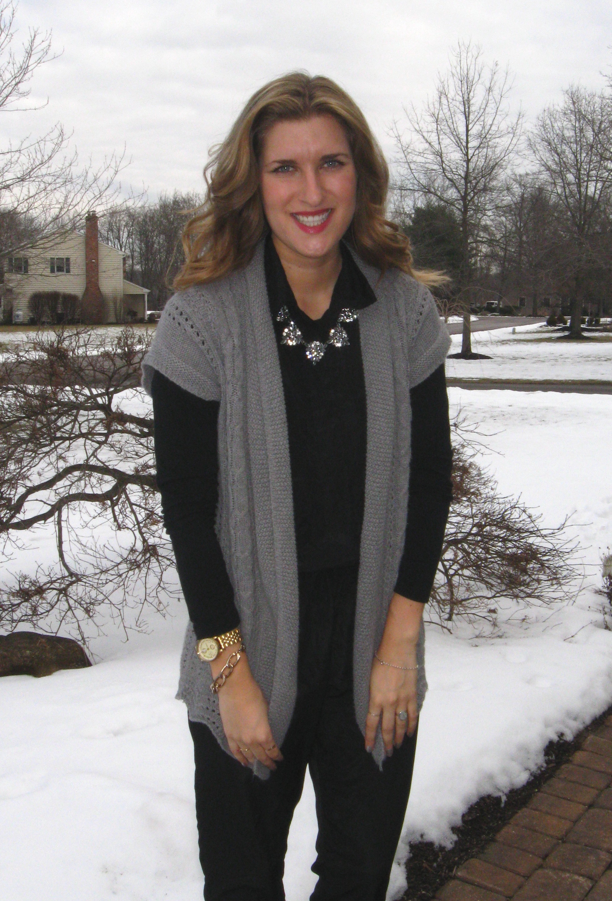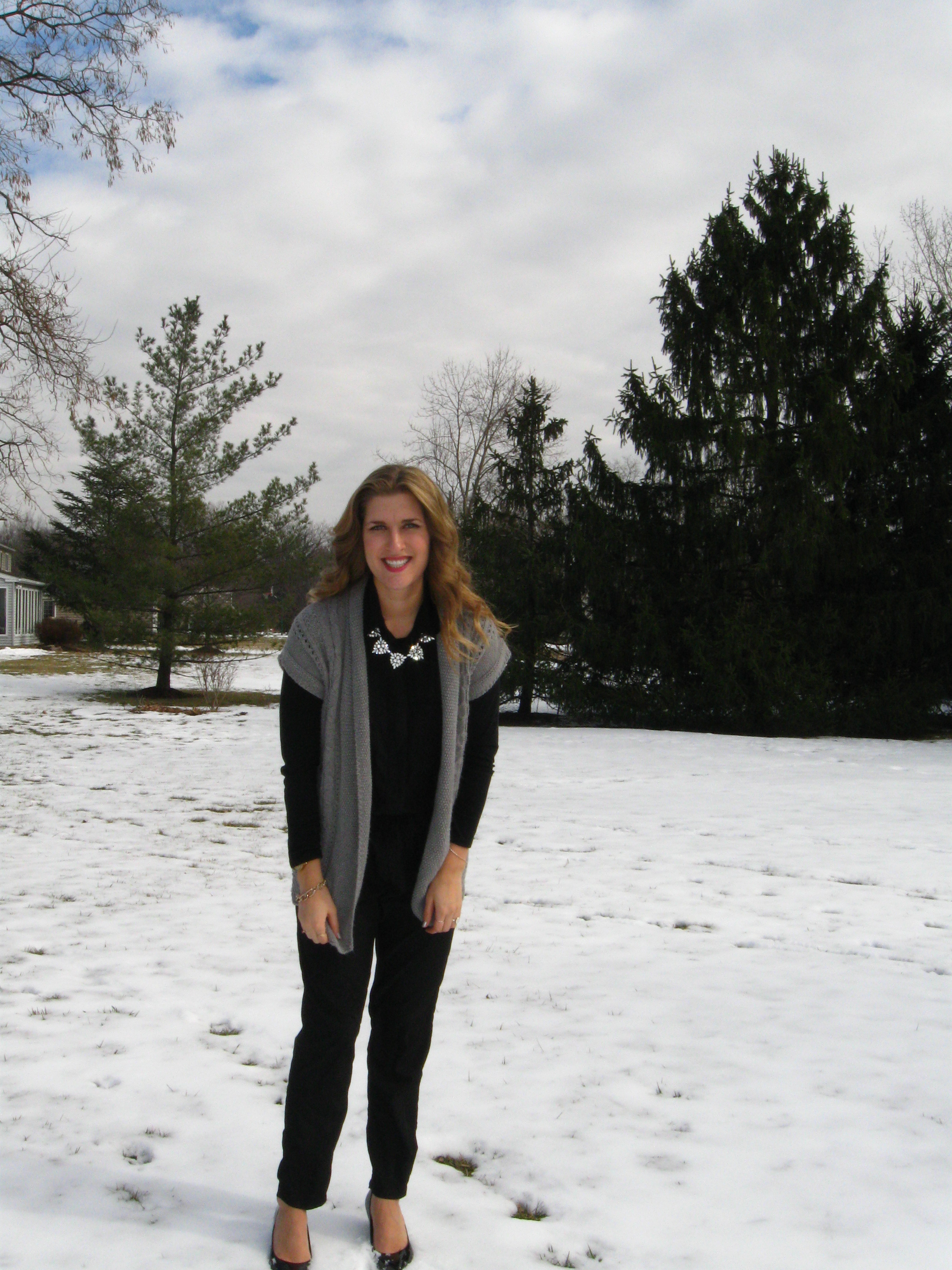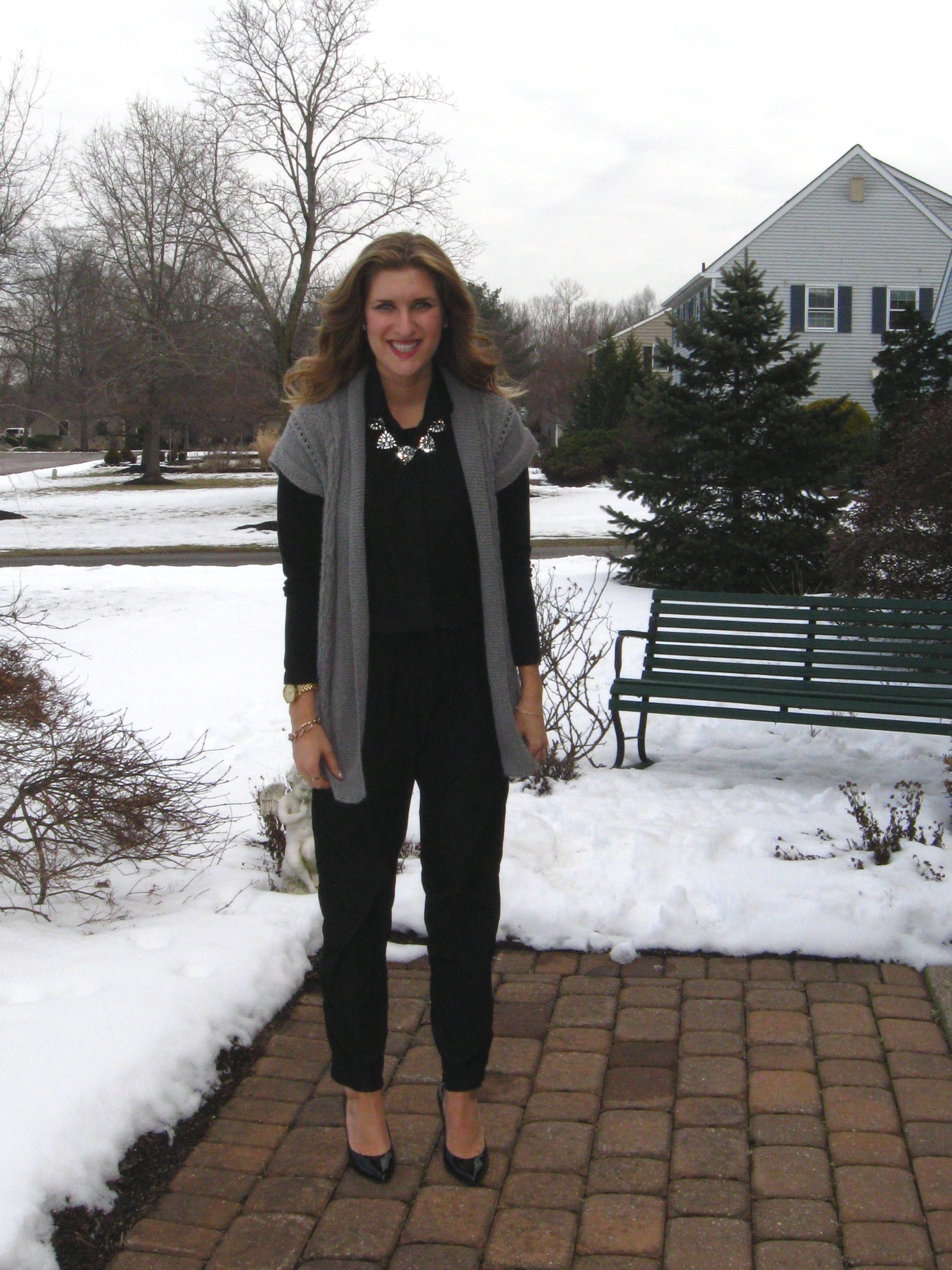 [Outfit Details: Jumpsuit: Target (old); Sweater: TJ Maxx; T-shirt: Target; Heels: Franco Sart0; Necklace: Bauble Bar]