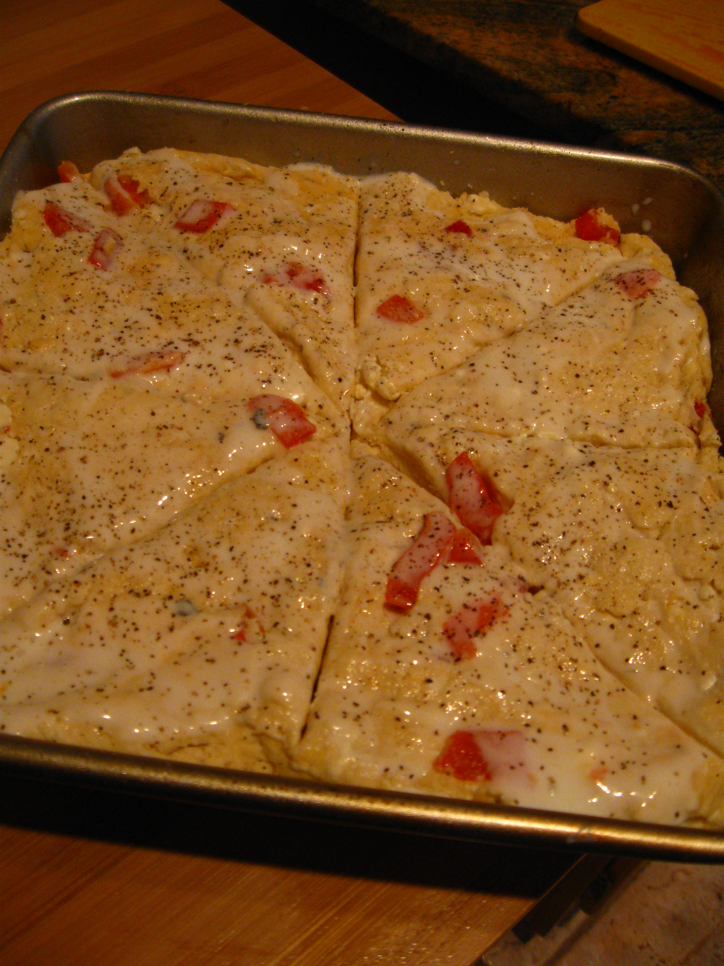 Once transferred to your baking sheet, mix 1 egg and 1 tsp water together, and brush this mixture over the dough. Sprinkle on whatever seasonings you want (I used oregano and onion salt)