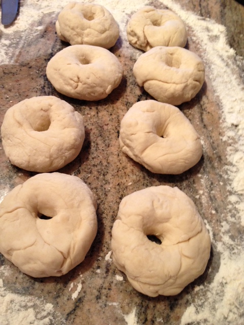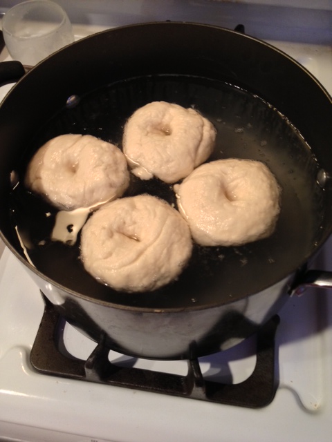 Once you have shaped all the bagels, allow them to rest for 10 minutes or so. Now place them into a pot of boiling water. They should float. Let them cook for 45 seconds to 1 minute on each side, then remove to your prepared baking sheet.