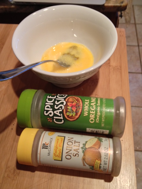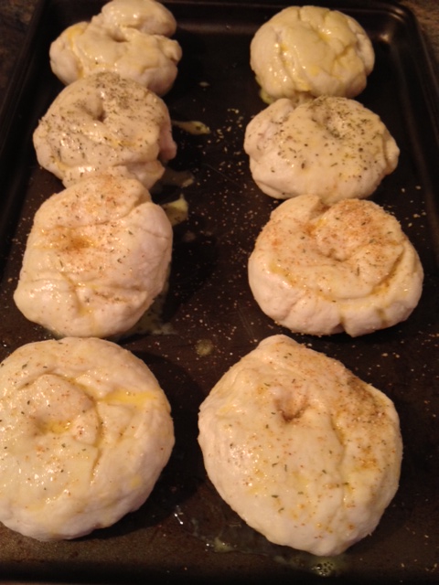 Once transferred to your baking sheet, mix 1 egg and 1 tsp water together, and brush this mixture over the dough. Sprinkle on whatever seasonings you want (I used oregano and onion salt)