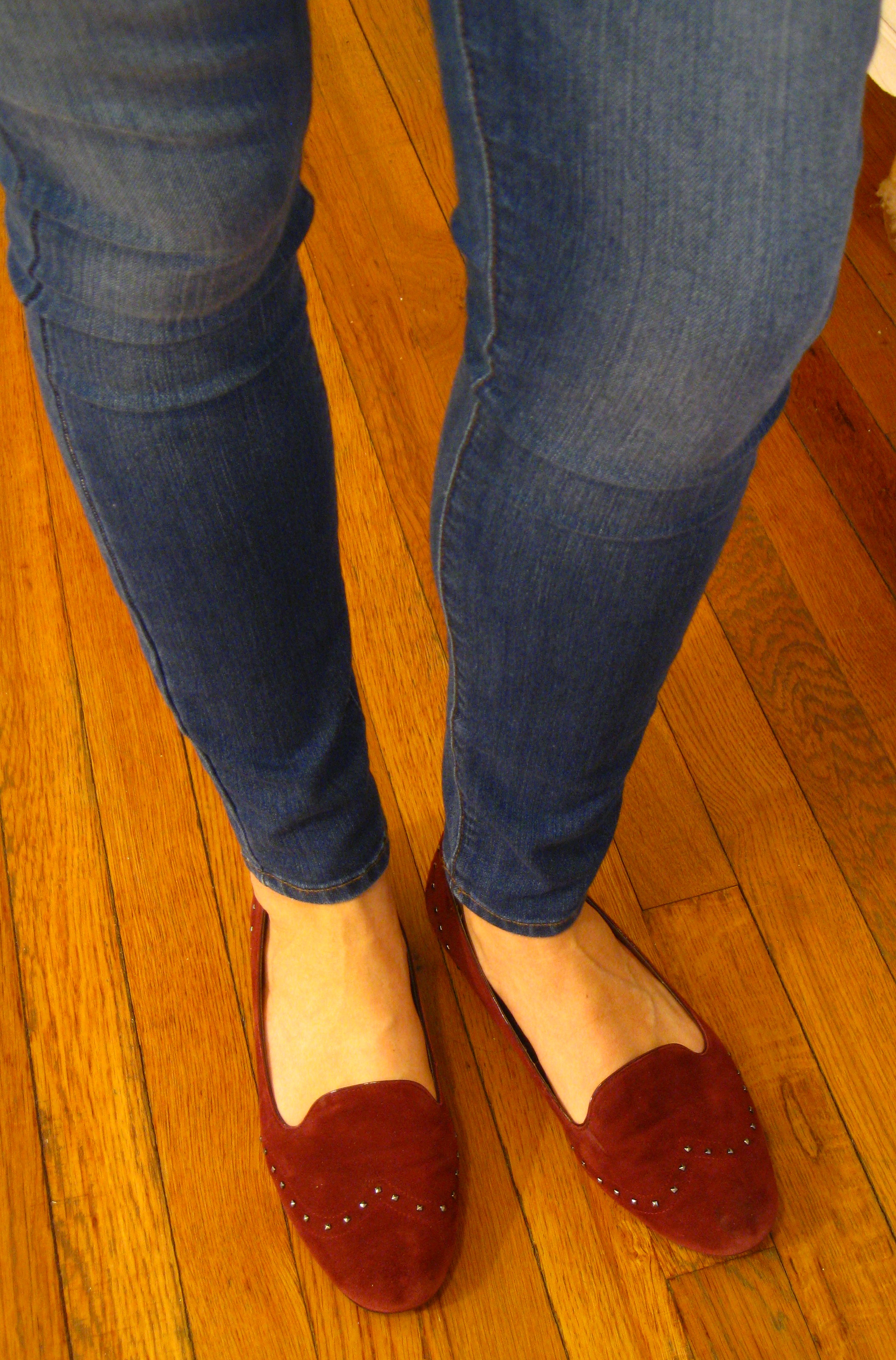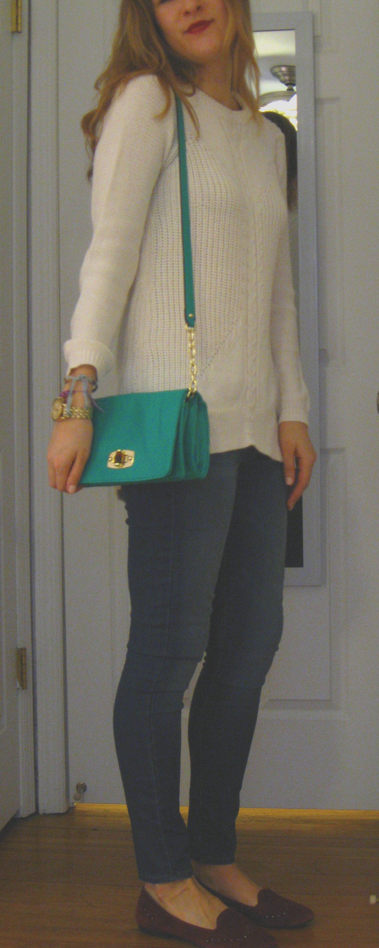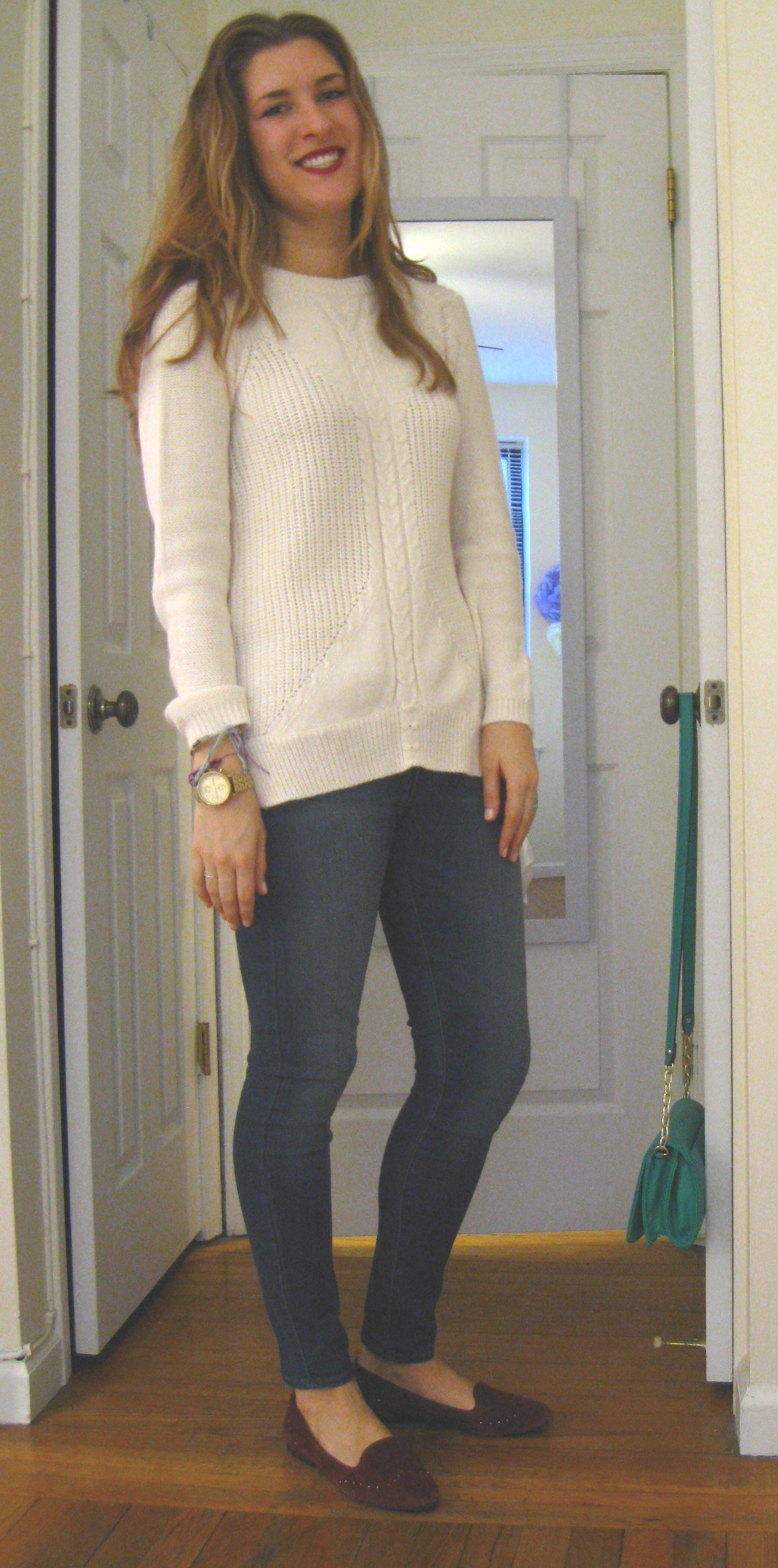 [Sweater: Zara, Jeans: Paige, Smoking Slippers: DKNYC, Bag: Target, Nails: Essie Sheer Bliss]