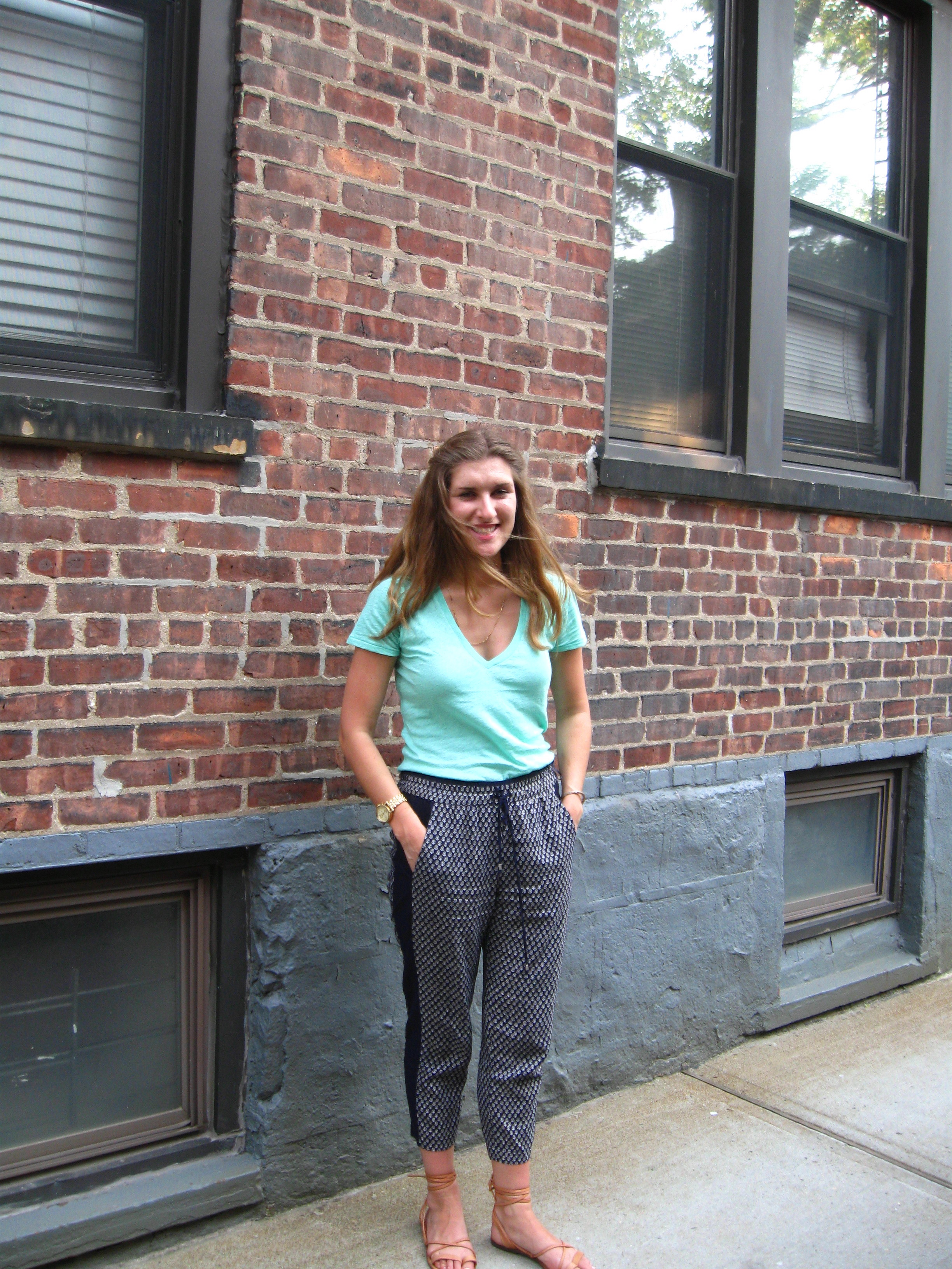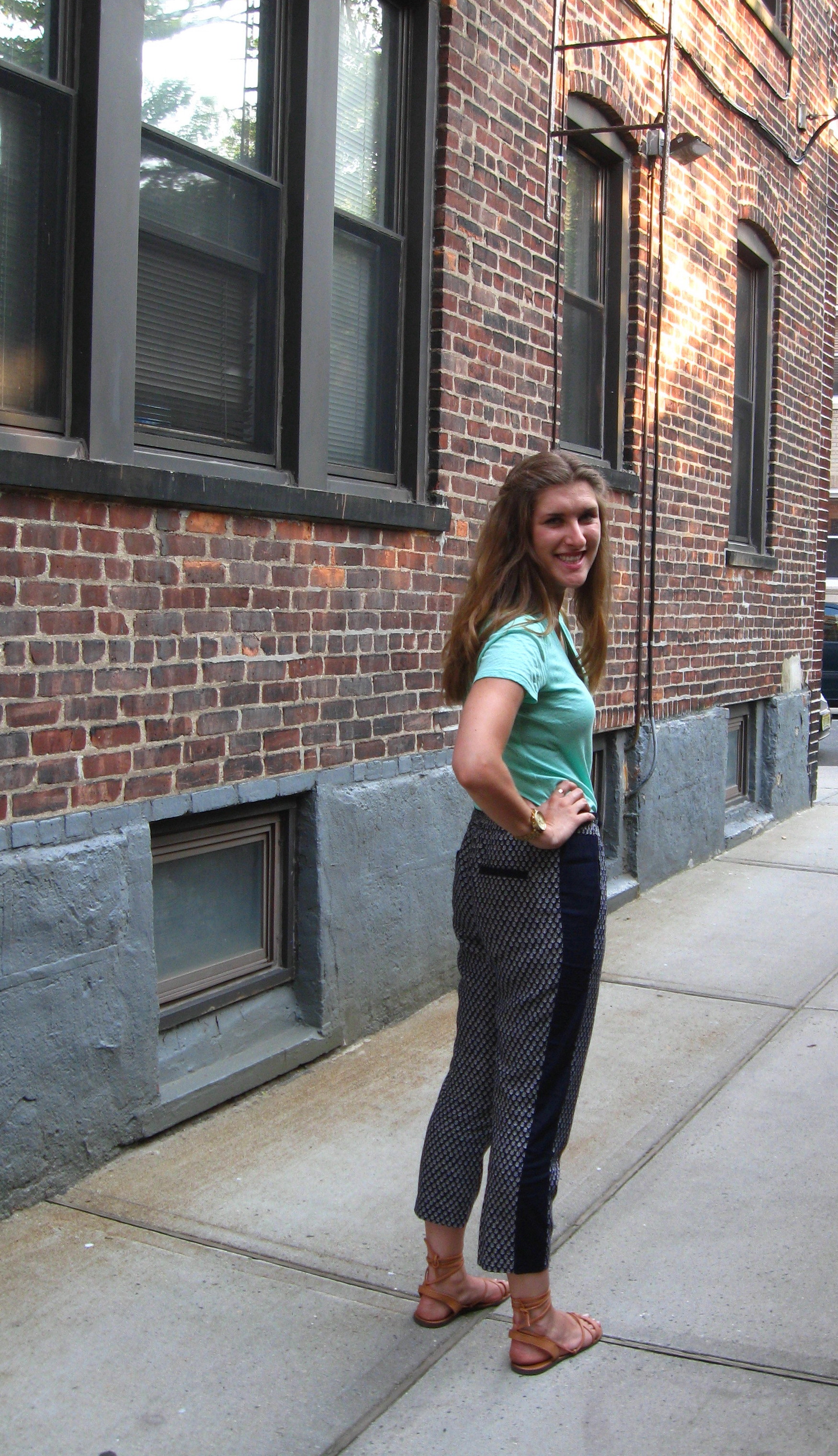 [The Details: Tee: J.Crew, Pants: Zara, Sandals: Madewell, Jewelry: Assorted]